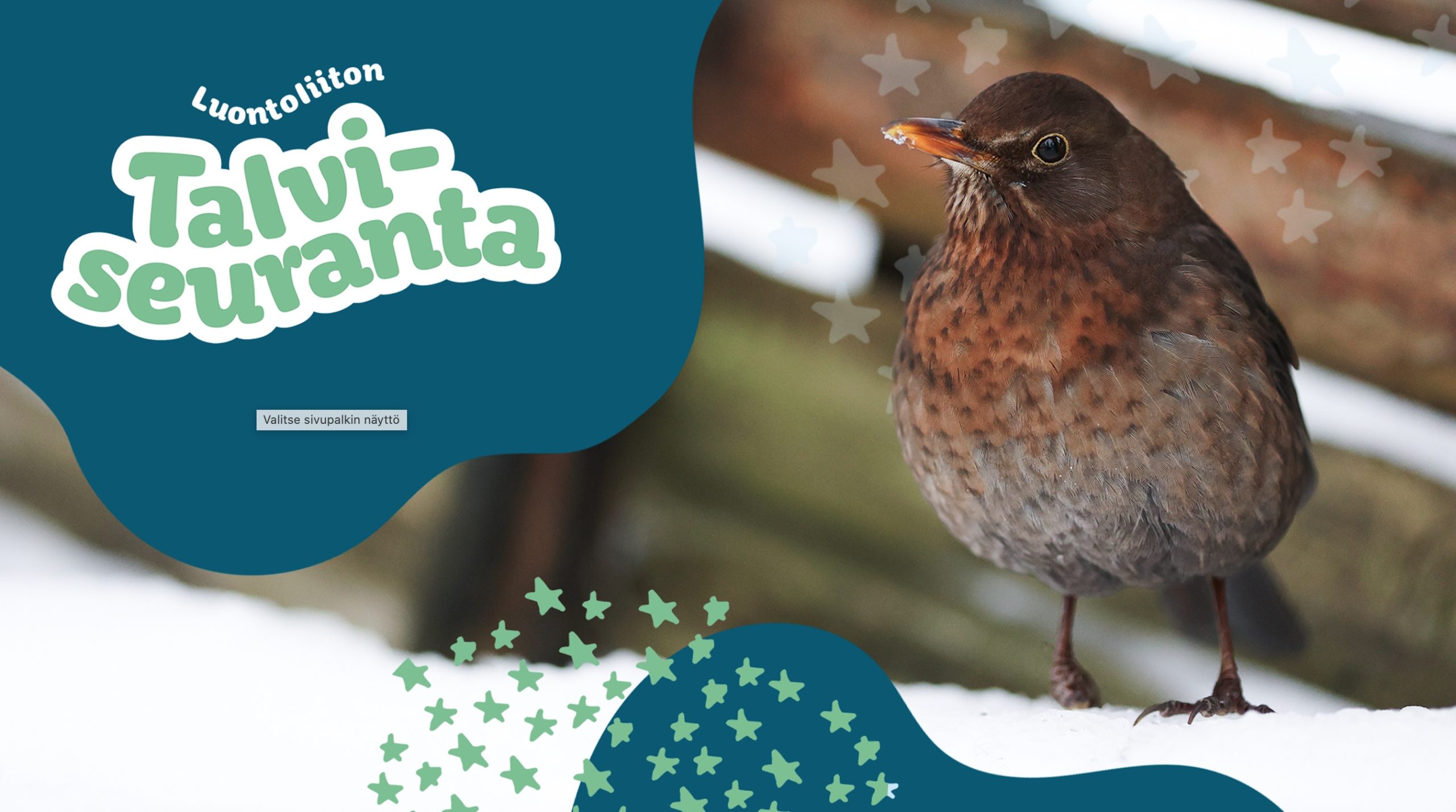 Luontoliiton Talviseuranta lähetettiin lukijoille joulukuun Siepossa. Nappaa lehdestä tai tulosta talvenhavaintokortit!  Lähetä täytetyt talvikortit Sieppoon viimeistään 14.4.2026. Osallistujien kesken arvotaan yllätyspalkintoja, ja tutkimustuloksista laaditaan talviraportti.